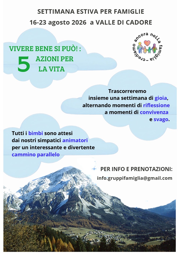 Campi estivi per famiglie 2025 Anche quest'anno il Collegamento Gruppi famiglia organizza un campo estivo: 10-17 agosto Barcis (Pordenone) Tema: Intelligenza artificiale. Indicazioni per l'uso. Relatori vari Info: Fiorenza e Antonio Bottero, 340 5195718, 375 6066265, antoniobottero@alice.it Per i campi proposti da Cuneo e da Caresto cliccate qui! |